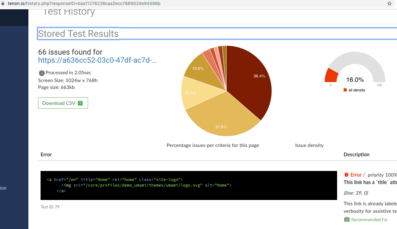We have the preview site working now, so it is time to view our Tenon.IO accessibility test results on Drupal 8’s Umami profile.