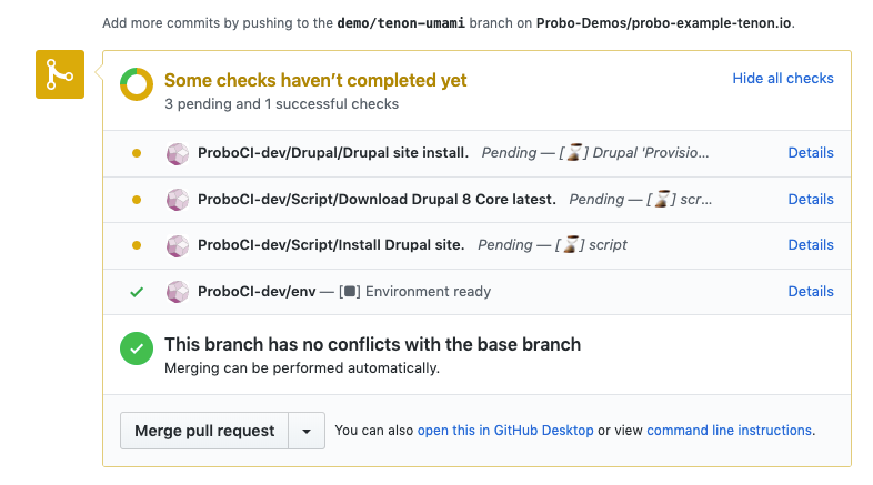 Create a pull request or merge request with your custom .probo.yaml file to start your first Probo Build. In our example we used our GitHub repository to make our changes, so we created a pull request there with our changes. You will see the build steps you setup running as checks at the bottom of your pull request.